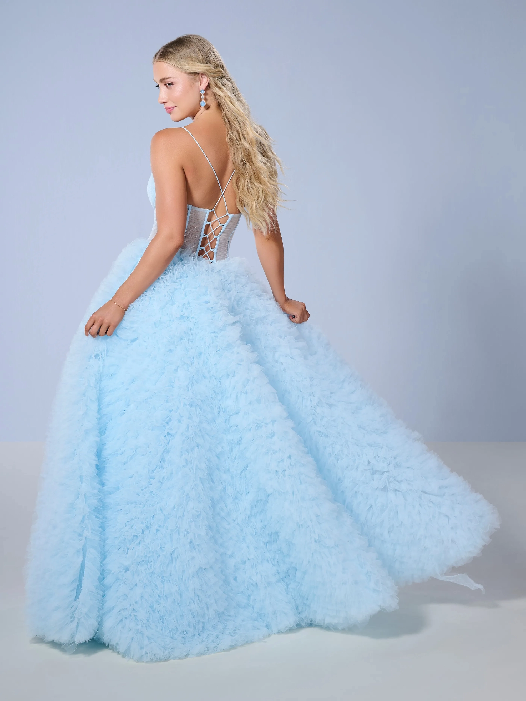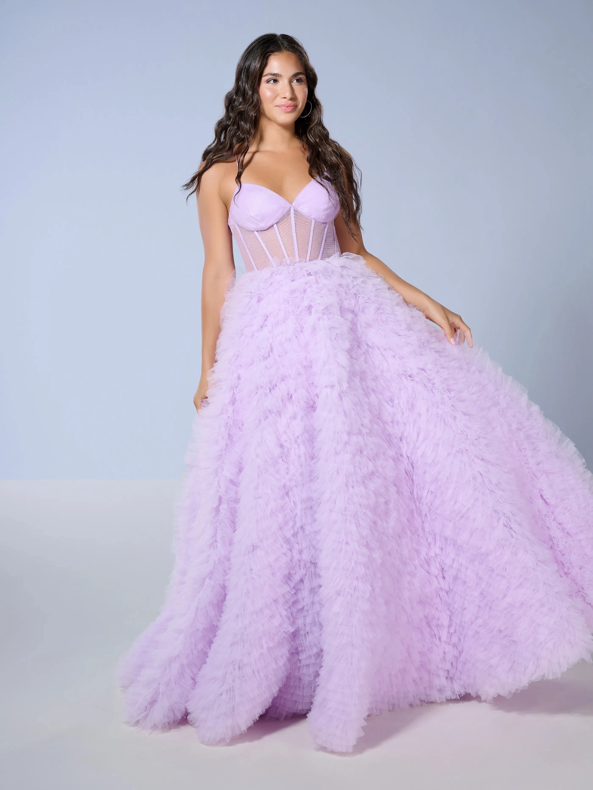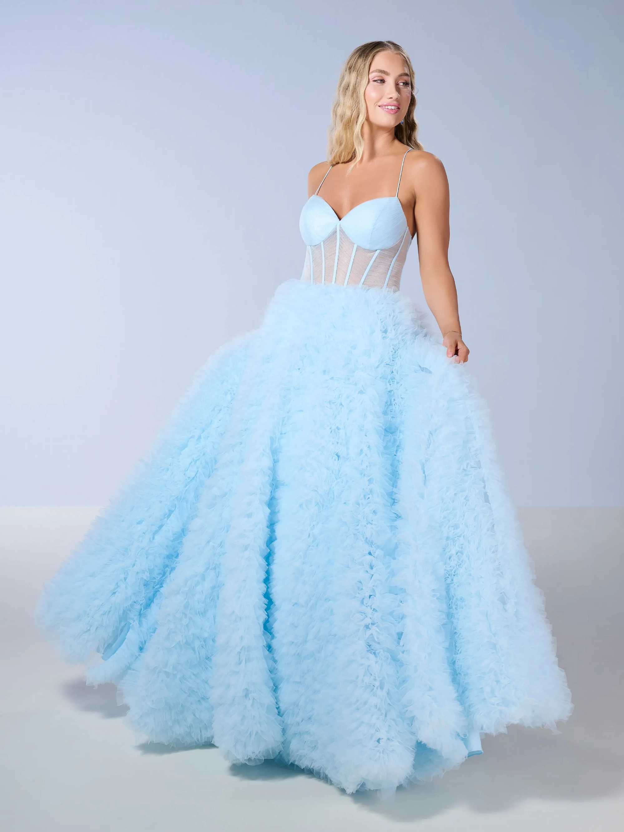 This is our floral applique/ ruffle tulle ballgown with a sweetheart neckline that leaves just the right special touch.